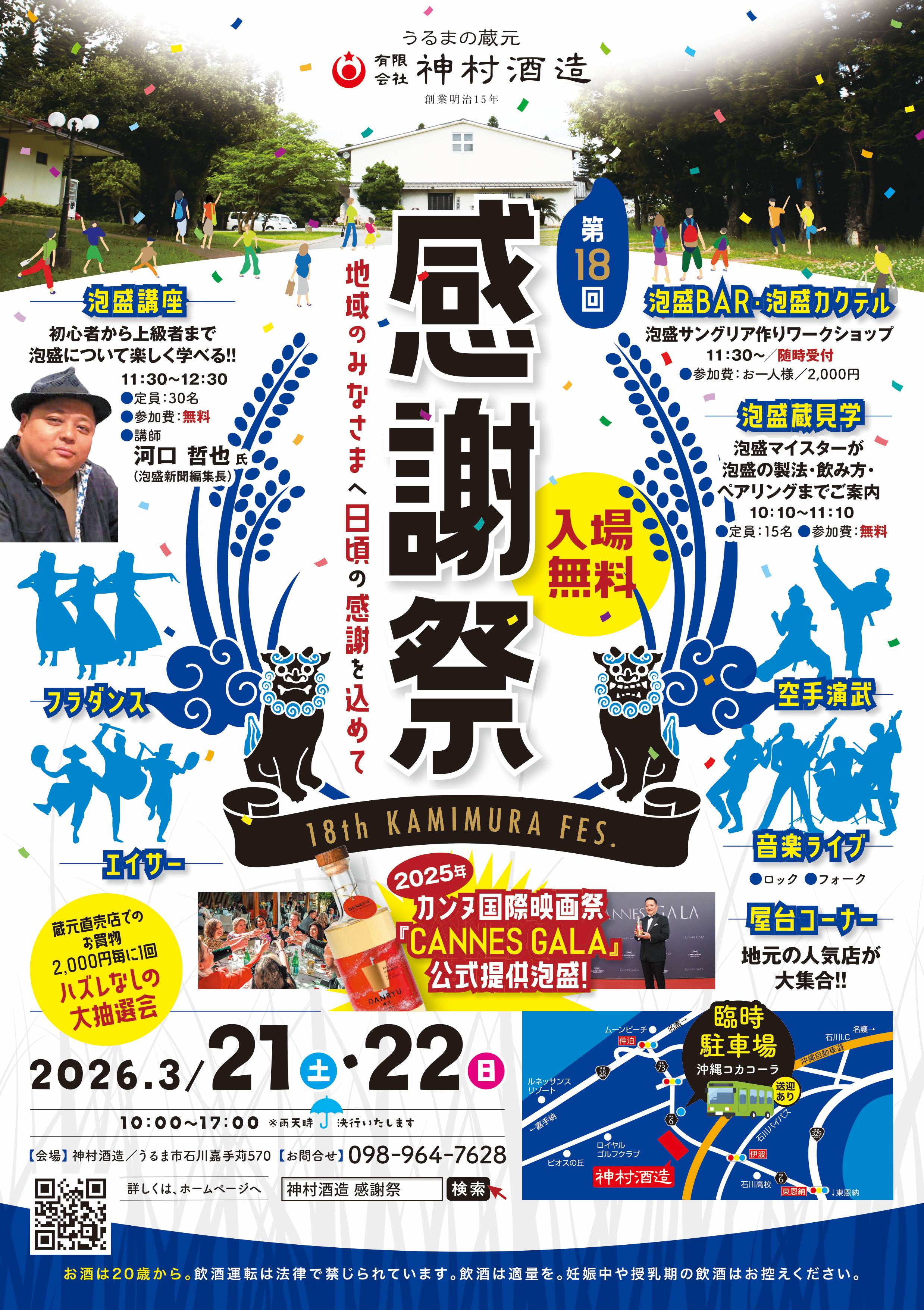ホーム 感謝祭 神村酒造ファンの皆様、日頃のご愛顧ありがとうございます。 お待たせしました!今年も神村酒造「感謝祭」を開催いたします。 ご家族やお友達と気軽にお越し下さい! 日 時:2026年3月21日(土)22日(日)10時~17時 会 場:神村酒造(うるま市石川嘉手苅570) 電 話:098-964-7628 駐車場:あり 入場料:無料 泡盛蔵見学の申込みは≫こちら 泡盛講座の申込みは≫こちら ※イベントの詳細については随時配信します。 商品一覧 該当商品はありません